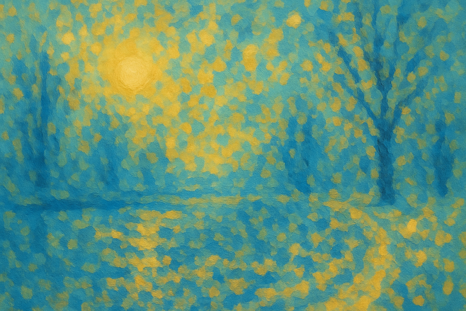 De bomen zijn schaduwen van zichzelf, strepen van melancholie in een landschap dat tegelijk troostrijk en fragiel is. Alsof je kijkt naar een moment dat niet langer blijft dan een ademhaling, maar toch eeuwig ergens in je borstkas wil wonen.